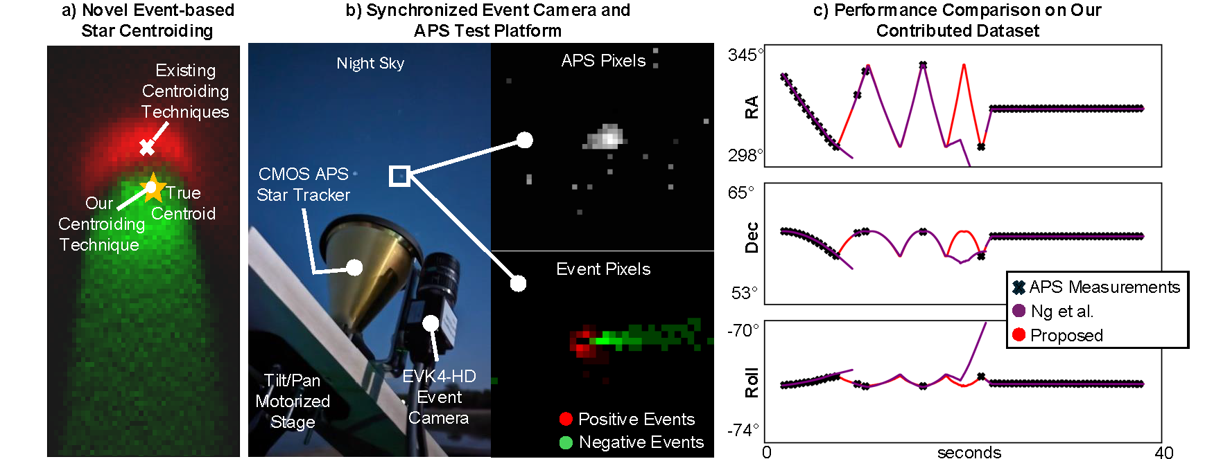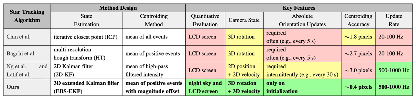 Overview of related works. Color indicates high (green), medium (yellow) and low (red) performance. āsā denotes seconds. Compared to previous works, ours is the only one to 1) be evaluated on night sky data that is open source, 2) incorporate 3D state estimation, 3) require absolute orientations updates only on initialization, and 4) have subpixel centroiding precision