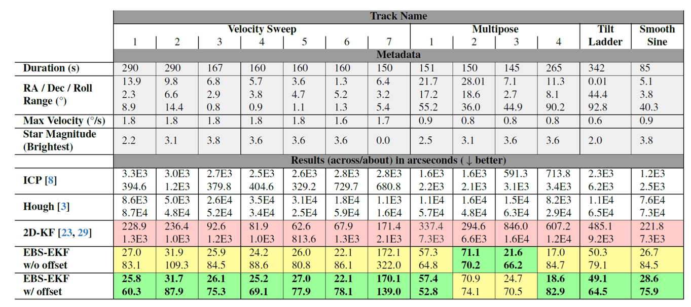 Metadata and tracking results for our real world dataset. Metrics are reported as (across, about) mean squared difference in arcseconds. Colors rank methods with the first (green), second (yellow), or third (red) lowest across and about means. Across all of the data runs, EBS-EKF is a magnitude or more accurate than the next closest algorithm. The intensity-dependent offset usually improves the accuracy due to the higher centroiding precision.
